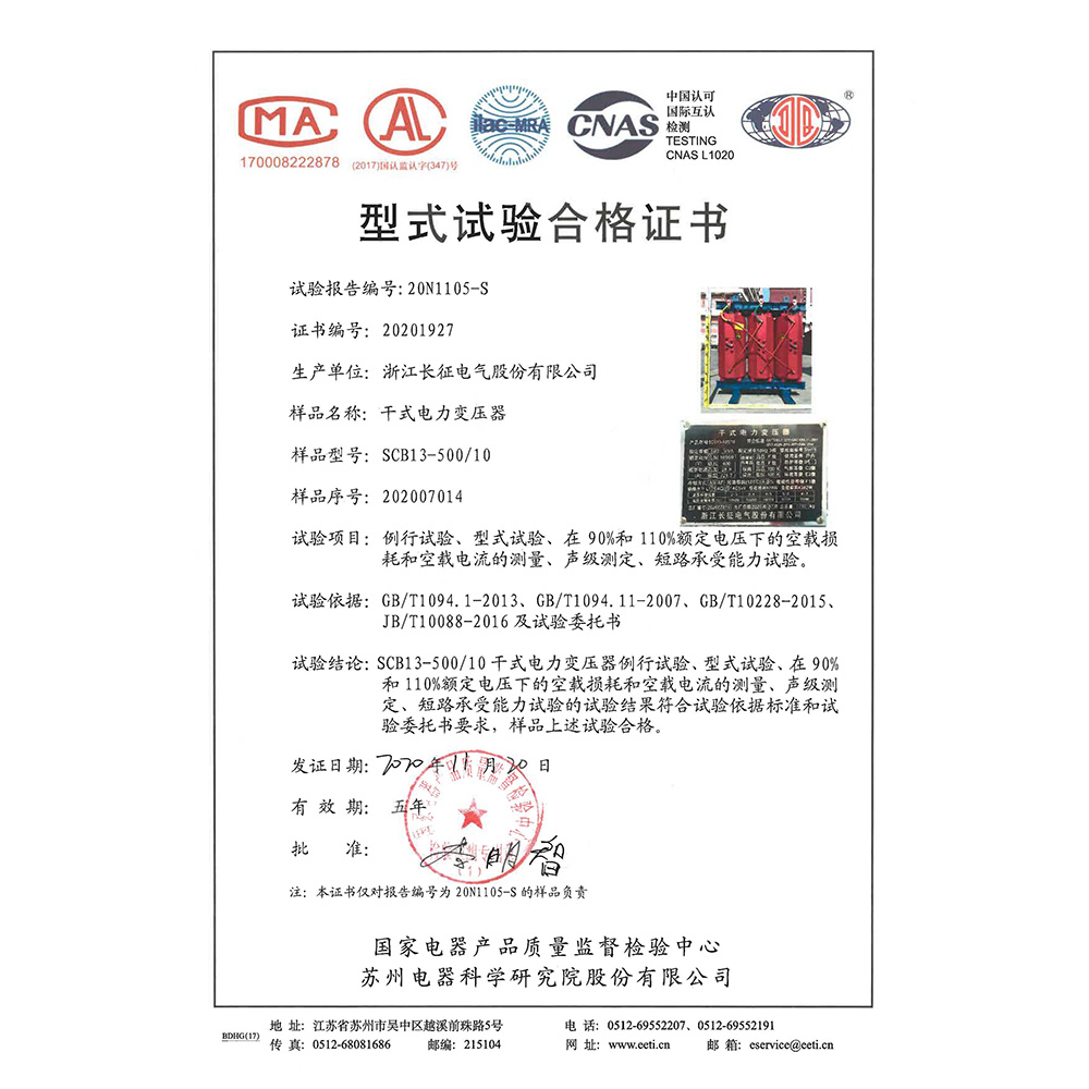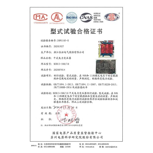 SCB13-500/10干式電力變壓器 型式試驗合格證書