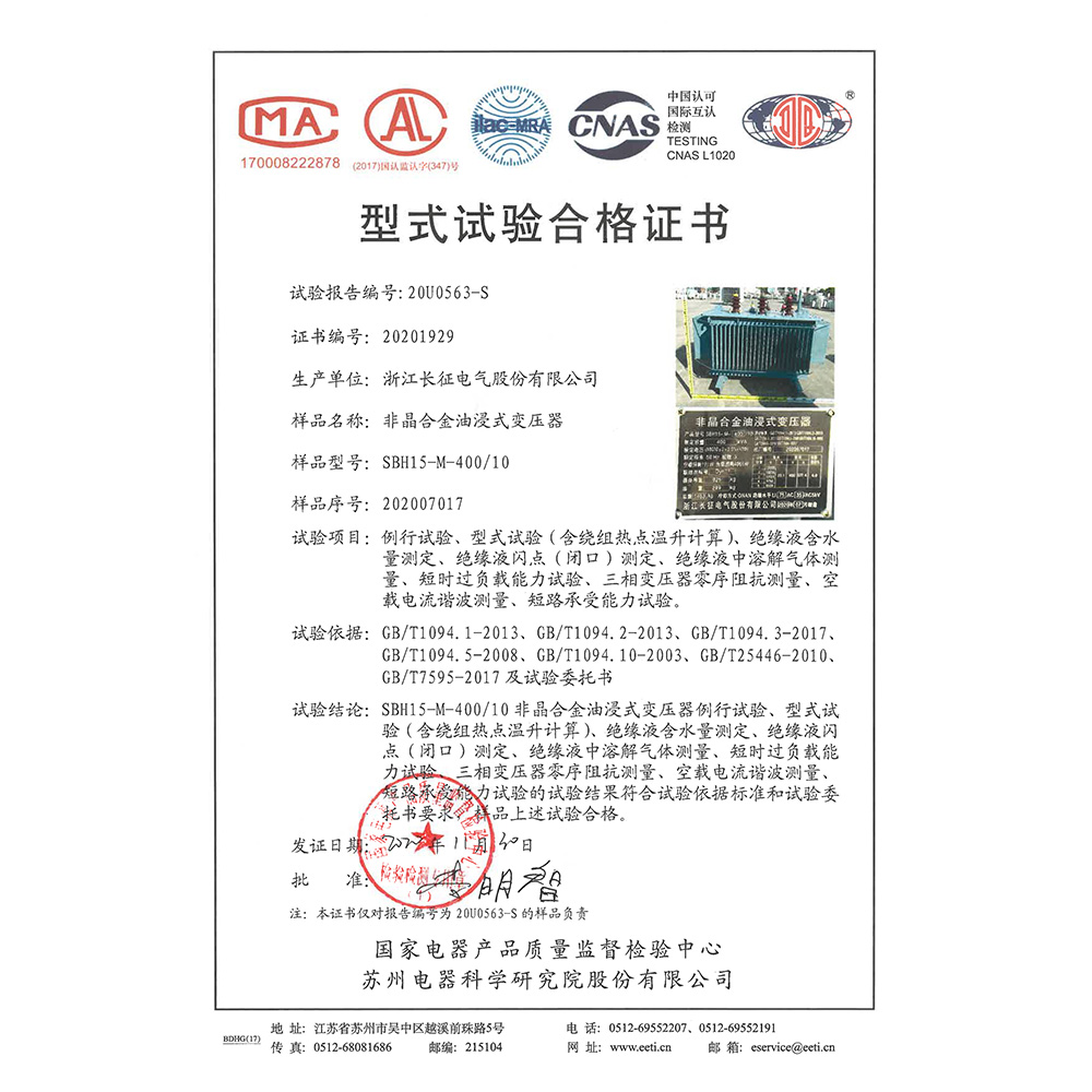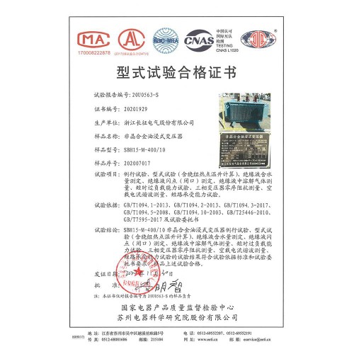 SBH15-M-400/10非晶合金油浸式變壓器 型式試驗合格證書