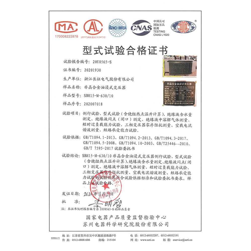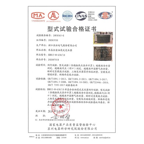 SBH15-M-630/10非晶合金油浸式變壓器 型式試驗合格證書