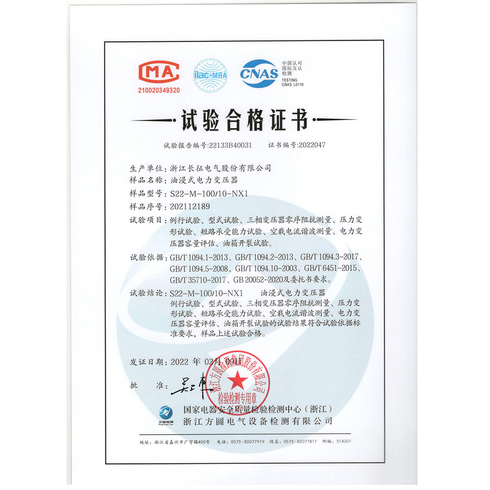 S22-M-100/10-NX1油浸式電力變壓器 試驗合格證書