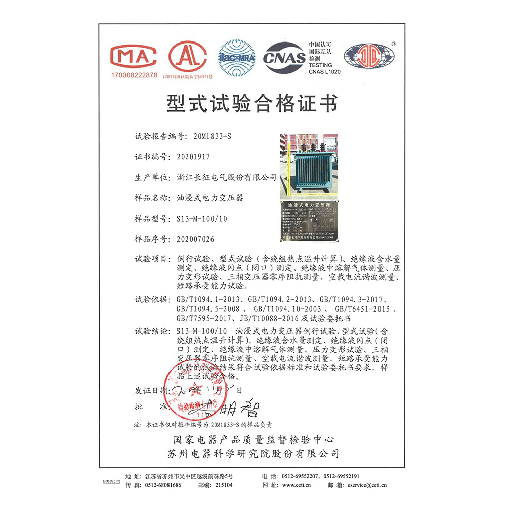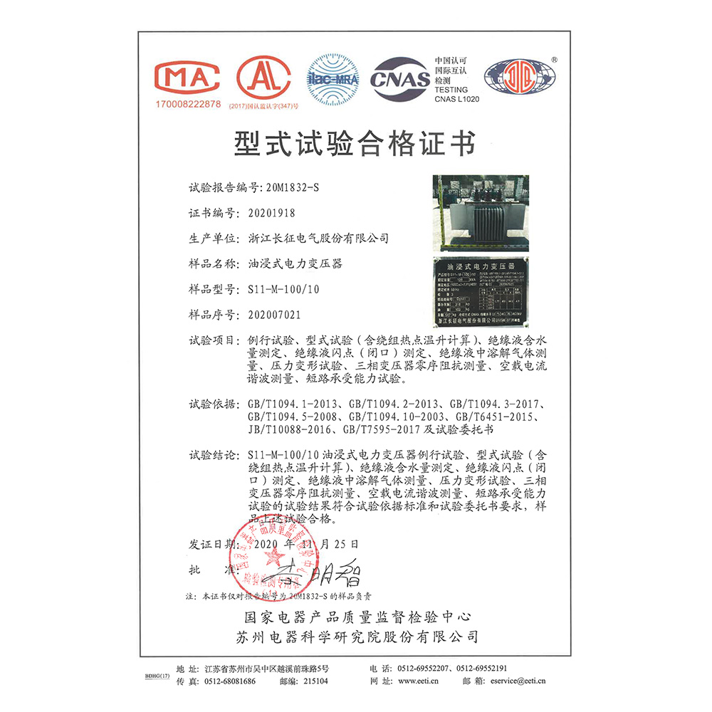 S11-M-100/10油浸式電力變壓器 型式試驗合格證書