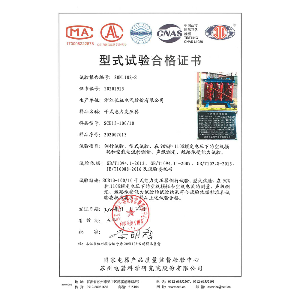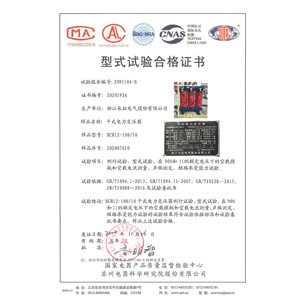 SCB12-100/10干式電力變壓器 型式試驗合格證書