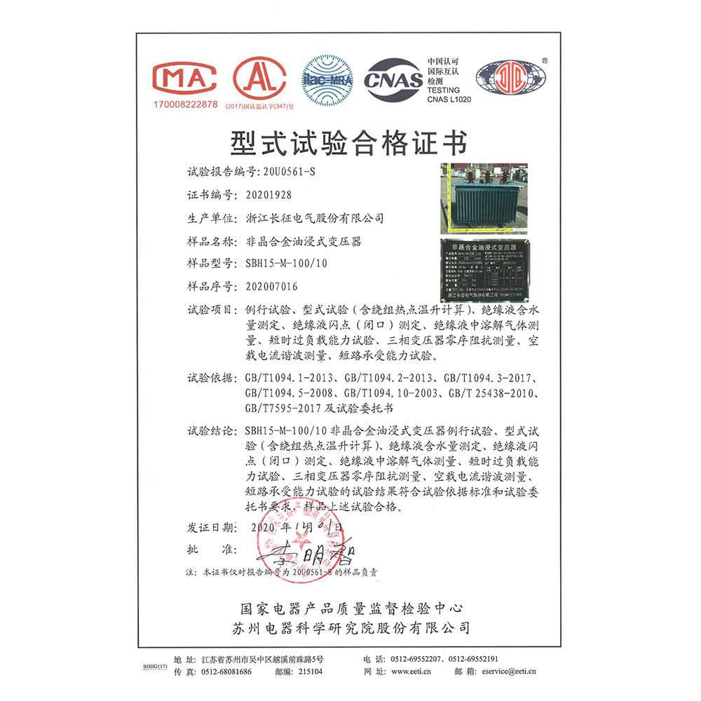 SBH15-M-100/10非晶合金油浸式變壓器 型式試驗合格證書