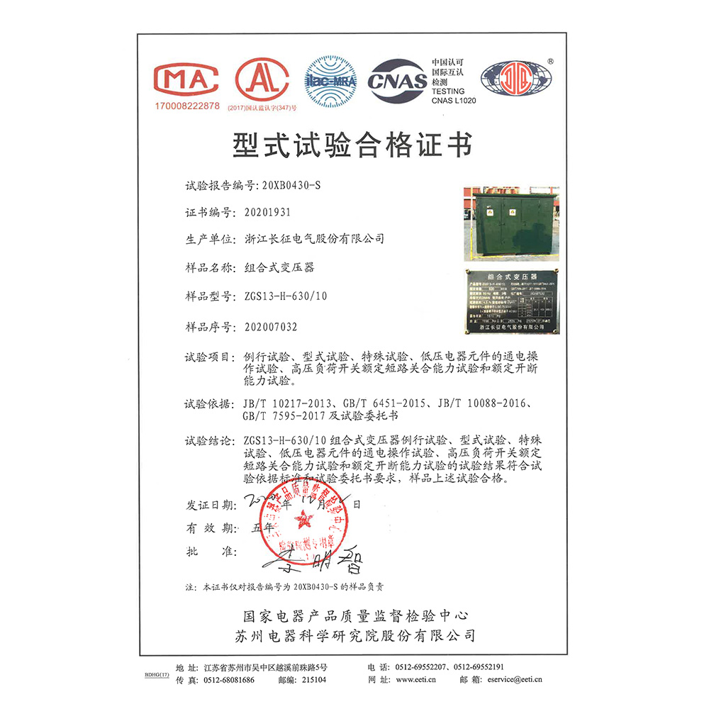 ZGS13-H-630/10組合式變壓器 型式試驗合格證書