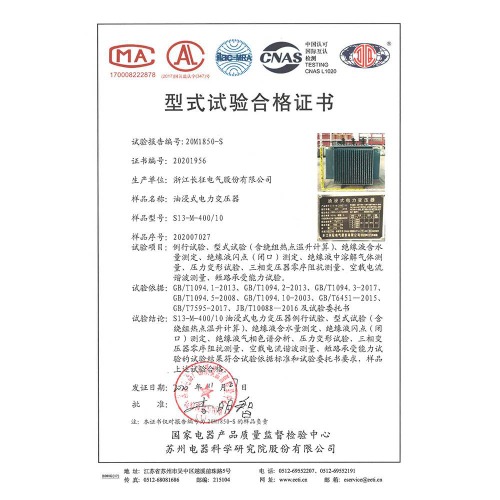 S13-M-400/10油浸式電力變壓器 型式試驗(yàn)合格證書(shū)