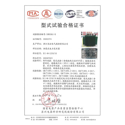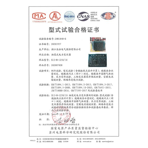 S11-M-1250/10油浸式電力變壓器 型式試驗(yàn)合格證書(shū)