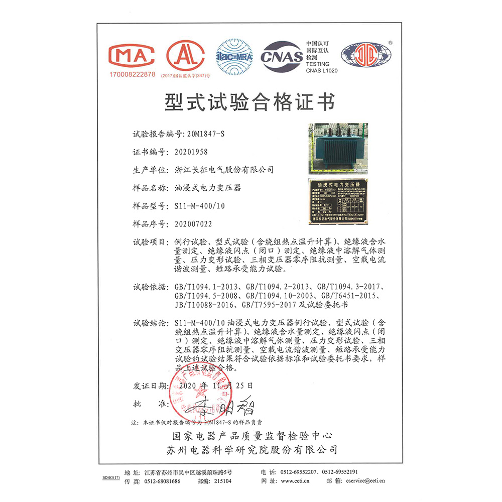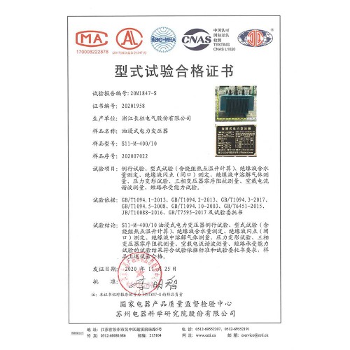 S11-M-400/10油浸式電力變壓器 型式試驗(yàn)合格證書(shū)