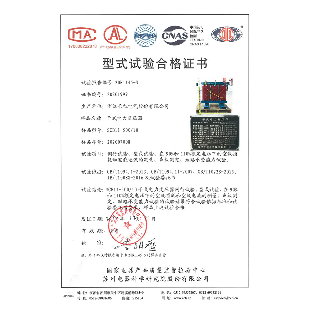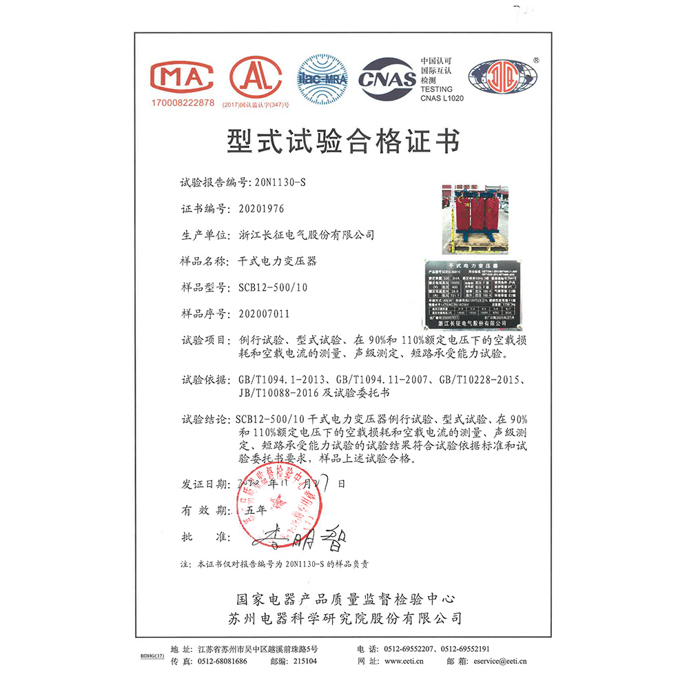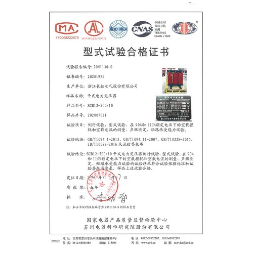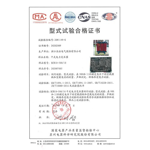 SCB10-500/10干式電力變壓器 型式試驗(yàn)合格證書(shū)