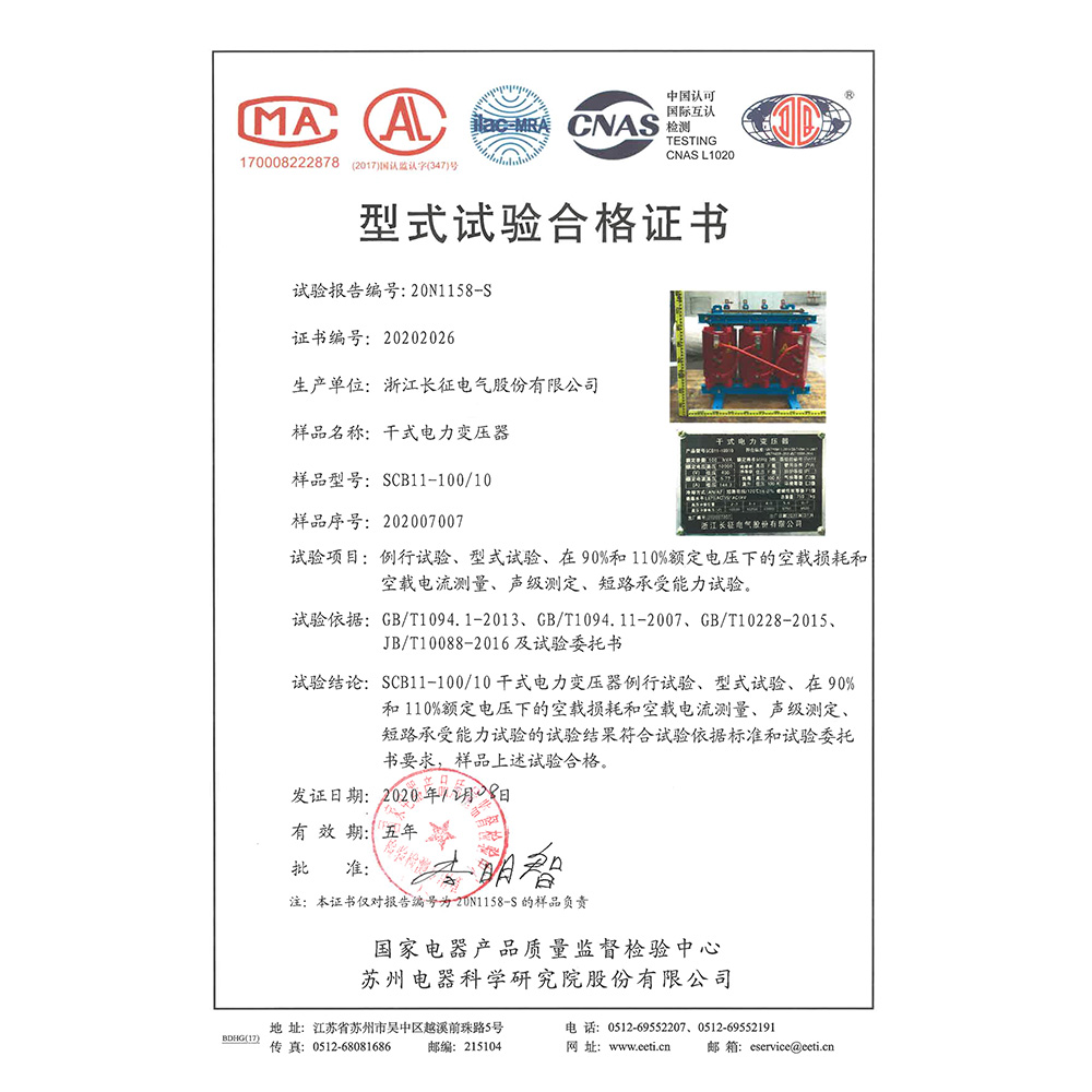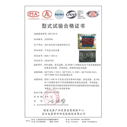 SCB11-100/10干式電力變壓器 型式試驗(yàn)合格證書(shū)