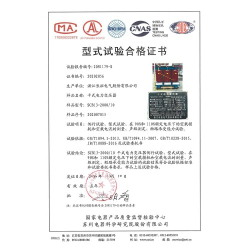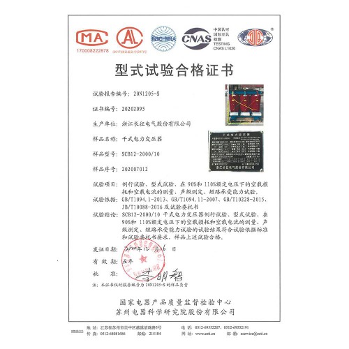 SCB12-2000/10干式電力變壓器 型式試驗(yàn)合格證書(shū)