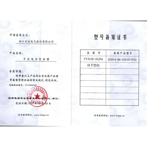 SCB14-30-125/10-NX2干式電力變壓器 型號備案證書