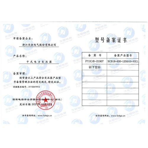 SCB18-630-1250/10-NX1干式電力變壓器 型號備案證書