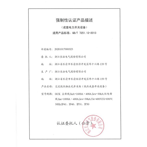 GCK 1600A~400A交流低壓抽出式開關(guān)柜(低壓成套開關(guān)設(shè)備)強制性認證產(chǎn)品描述