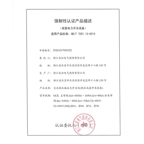 GCK 4000A~1600A交流低壓抽出式開關(guān)柜(低壓成套開關(guān)設(shè)備)強制性認證產(chǎn)品描述