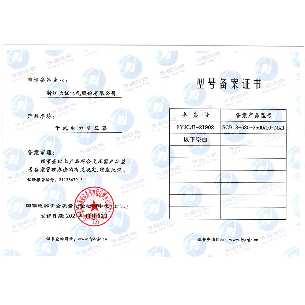 SCB18-630-2500/10-NX1干式電力變壓器 型號備案證書