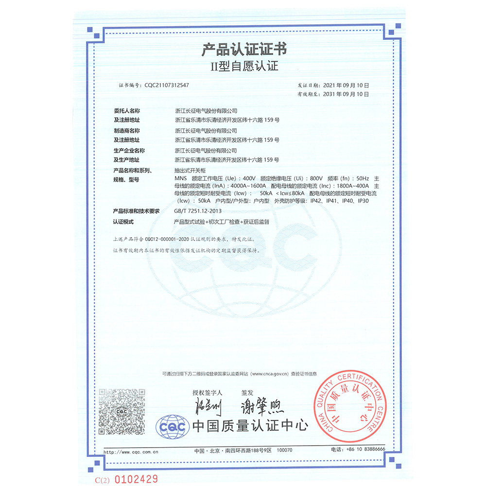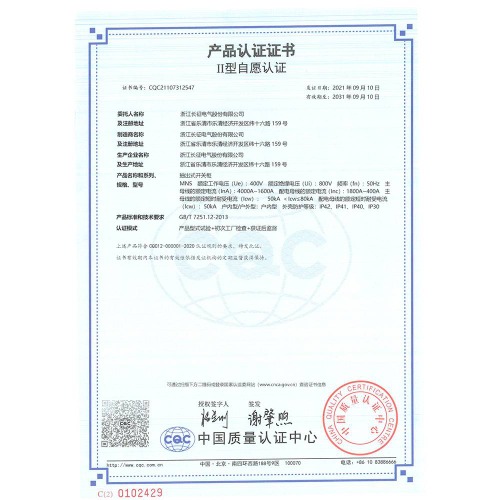 MNS抽出式開關柜 產(chǎn)品認證證書