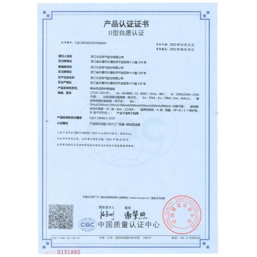 CZLE6-250/3N剩余電流保護斷路器 產(chǎn)品認證證書