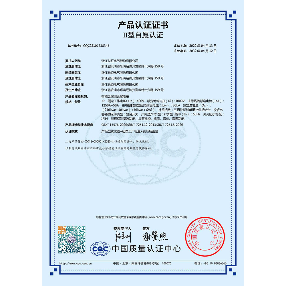 JP智能金屬綜合配電箱 產(chǎn)品認證證書