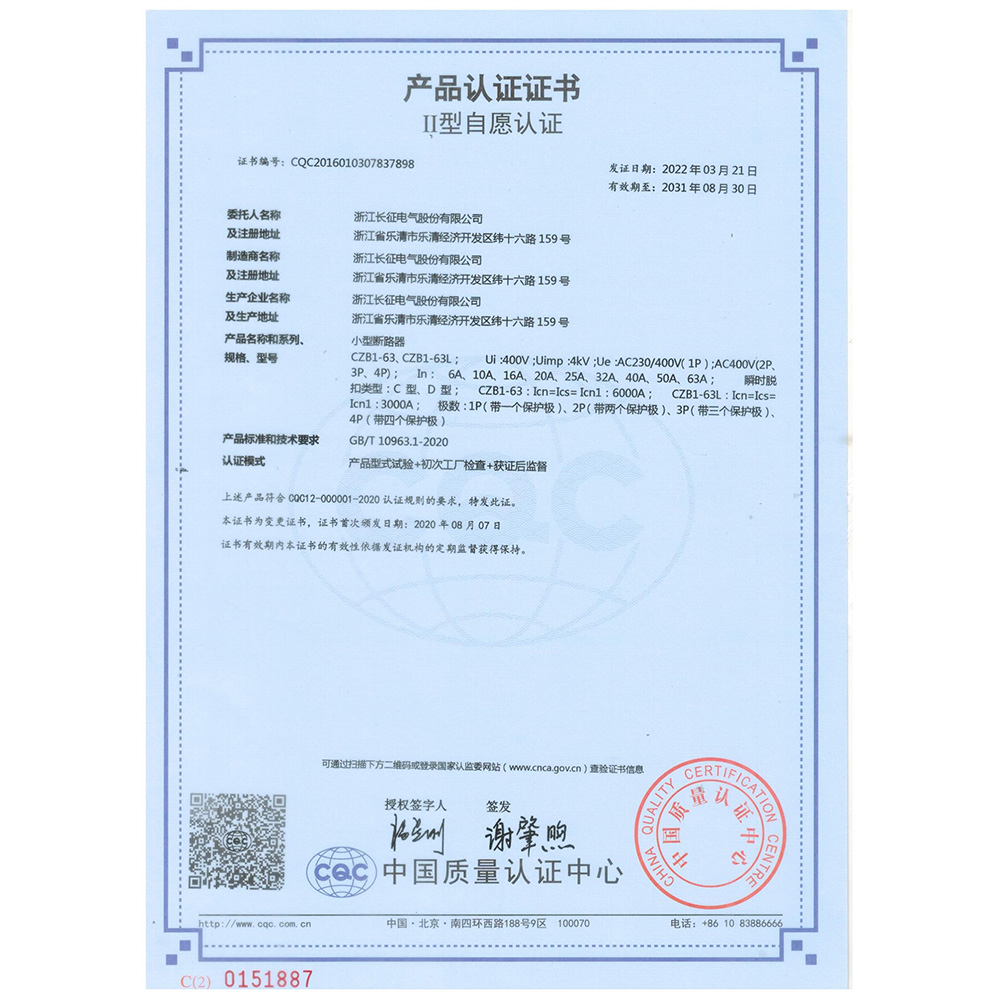 CZB1-63、CZB1-63L小型斷路器 產(chǎn)品認證證書