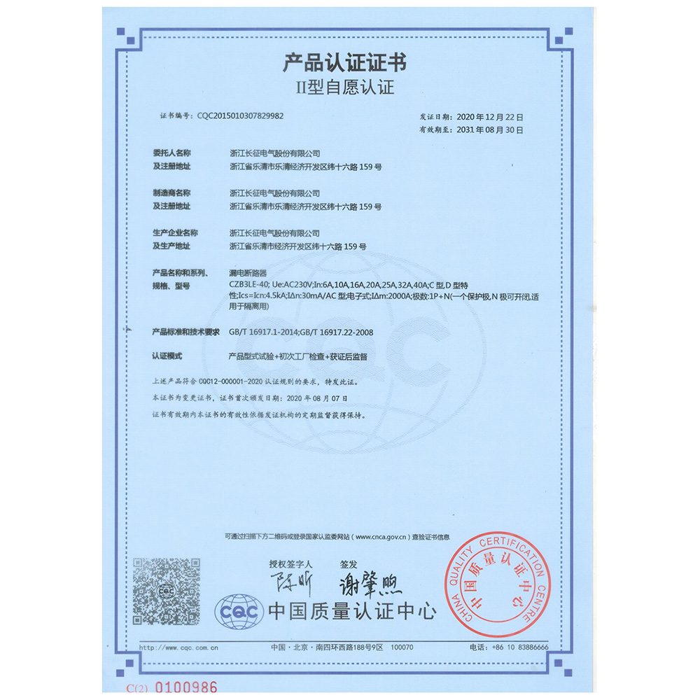CZB3LE-40漏電斷路器 產(chǎn)品認證證書