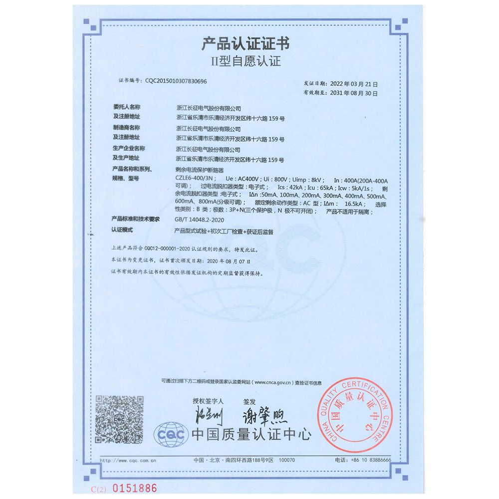 CZLE6-400/3N剩余電流保護斷路器 產(chǎn)品認證證書