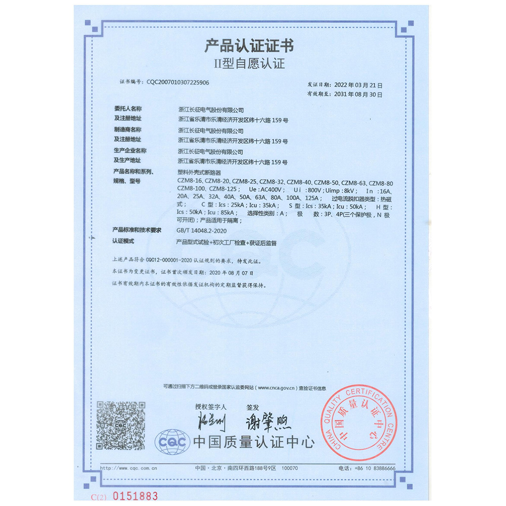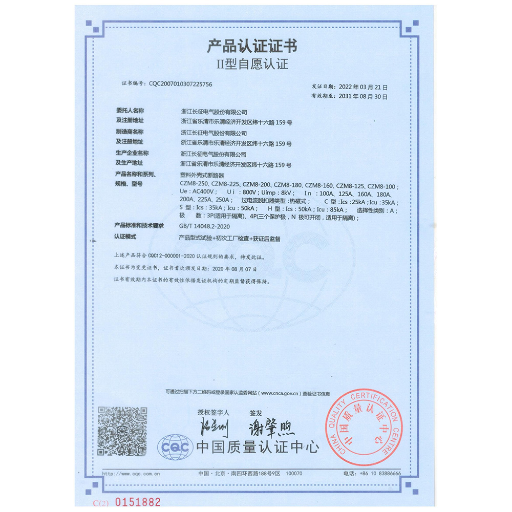 CZM8塑料外殼式斷路器 產(chǎn)品認證證書