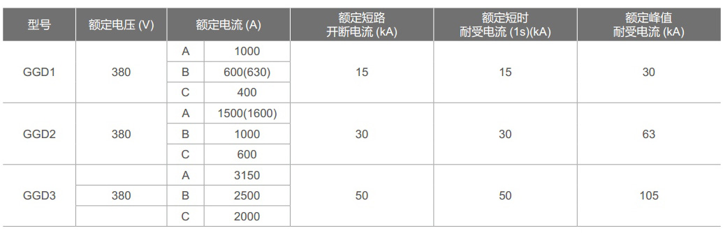 主電路方案是征求了廣大設計、使用部門的意見選編的,增加了發電廠需要的方案。額定電流至3150A,適合2000kVA及以下的配電變壓器選用。此外,為適應無功補償的需要設計了GGJ 1、GGJ2電容補償柜,其主電路方案4個,共12個規格。